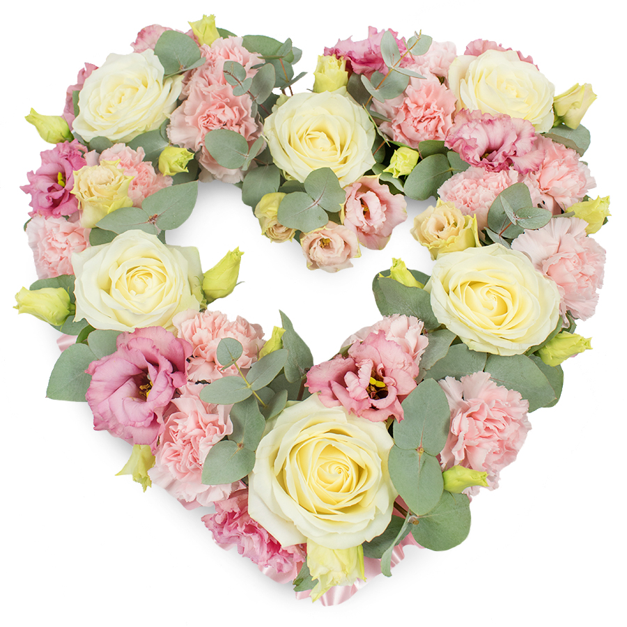 This refined arrangement is crafted to honor and celebrate a lifetime of memories. The combination of white roses, pink carnations, and pink lisianthus intermingled with crisp eucalyptus leaves results in a bouquet that is both sophisticated and soothing.